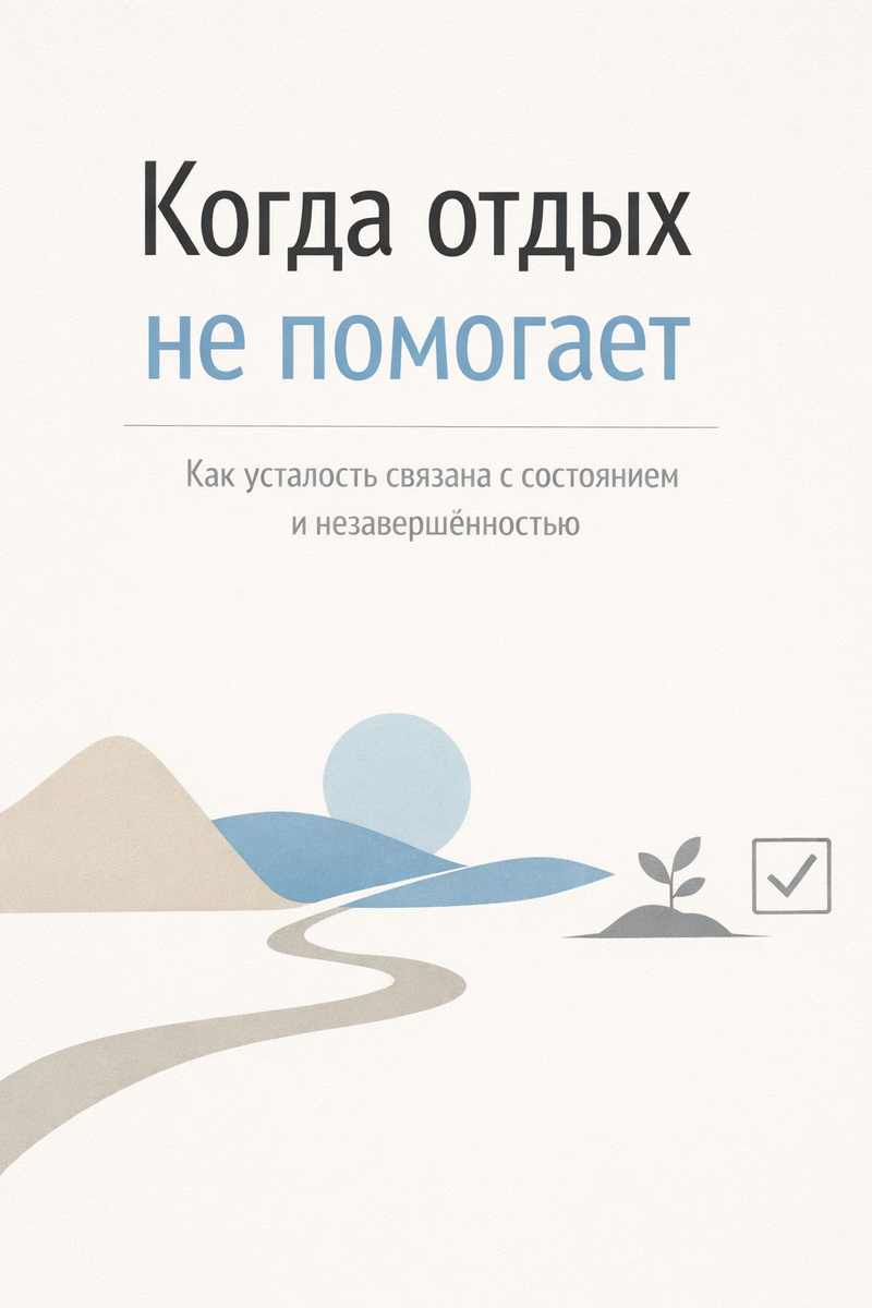 Совет «просто отдохни» обычно произносят как нечто само собой разумеющееся. Устал — значит, надо перестать действовать: лечь, отключиться, пролистать ленту или включить сериал. Иногда такой способ действительно срабатывает. Но нередко происходит обратное: время прошло, а усталость никуда не делась — а иногда даже стала острее. Дело в том, что усталость не всегда возникает из-за избытка нагрузки. Часто она появляется из-за того, как устроена деятельность и в каком состоянии человек в ней находится. Истощать может не сама работа, а неопределённость, растянутое ожидание, постоянная готовность реагировать, фоновое напряжение, ощущение незавершённости. Всё то, что требует непрерывного внутреннего присутствия и не даёт нам выдохнуть. Когда человек ничего не делает, тело действительно получает передышку. С психикой всё сложнее. Если в фоне остаются незакрытые задачи, тревожные мысли или ощущение неизбежного «потом», внутреннее напряжение не исчезает. Мозг продолжает работать, потому что ситуа
