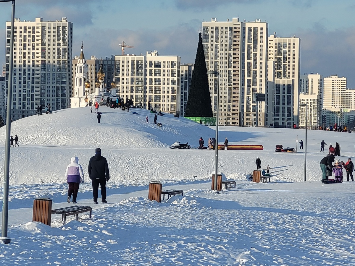Уговорили внуки съездить куда-нибудь, с горок покататься. Подумали и решили сгонять в Академический район. По слухам, там неплохие горки. Съездили, покатались. И правда, горки неплохие. Народу катается много. И на ледянках, и на бубликах, и на снегокатах. Есть даже аттракцион на "банане" по снегу. Правда, на фанерках и на картонках, как в нашем детстве, никого не увидел. Длинный вал со множеством спусков разной высоты и с разным уклоном. Фото с самой высокой горки. Спортплощадка пустует. Как и качели. С самой вершины виден храм, о котором я писал подробнее в одном из предыдущих постов. А на самой вершине стоит олень. От которого, с самой высокой точки, все стремятся съехать. Стихийная очередь на спуск. Все ездят аккуратно. Пока мы там были, не видели столкновений. Нигде спуски не выходят на проезжую часть. Вот такие укатанные склоны. Вид на здание Администрации Академического района (с флагом). Многие меняют горки. Покатались на одних склонах, переходят на другие. Внуки меня тоже прота