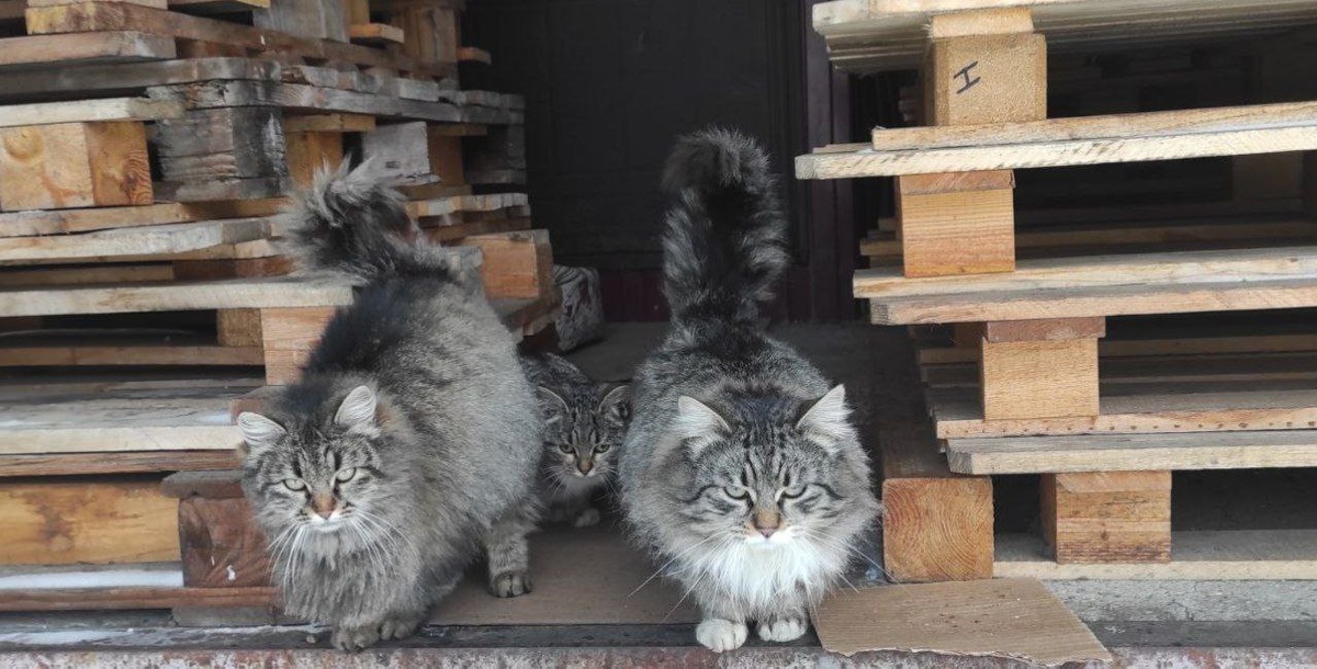 Кот-Горыныч на месте, в полном составе! Обросшие как мамонты Кошачья Матерь и Вредный зевун, Новенькая и вредная мелкая. Все высыпали встречать подъехавший обед. Миски с сухим кормом у них полные, поэтому выдала каждому по паре пакетиков дичи в желе, а сухой корм оставила в паллетах, рабочие заберут и будут выдавать по мере необходимости. Так что смело могу сказать, Кот-Горыныч бодр и накормлен!