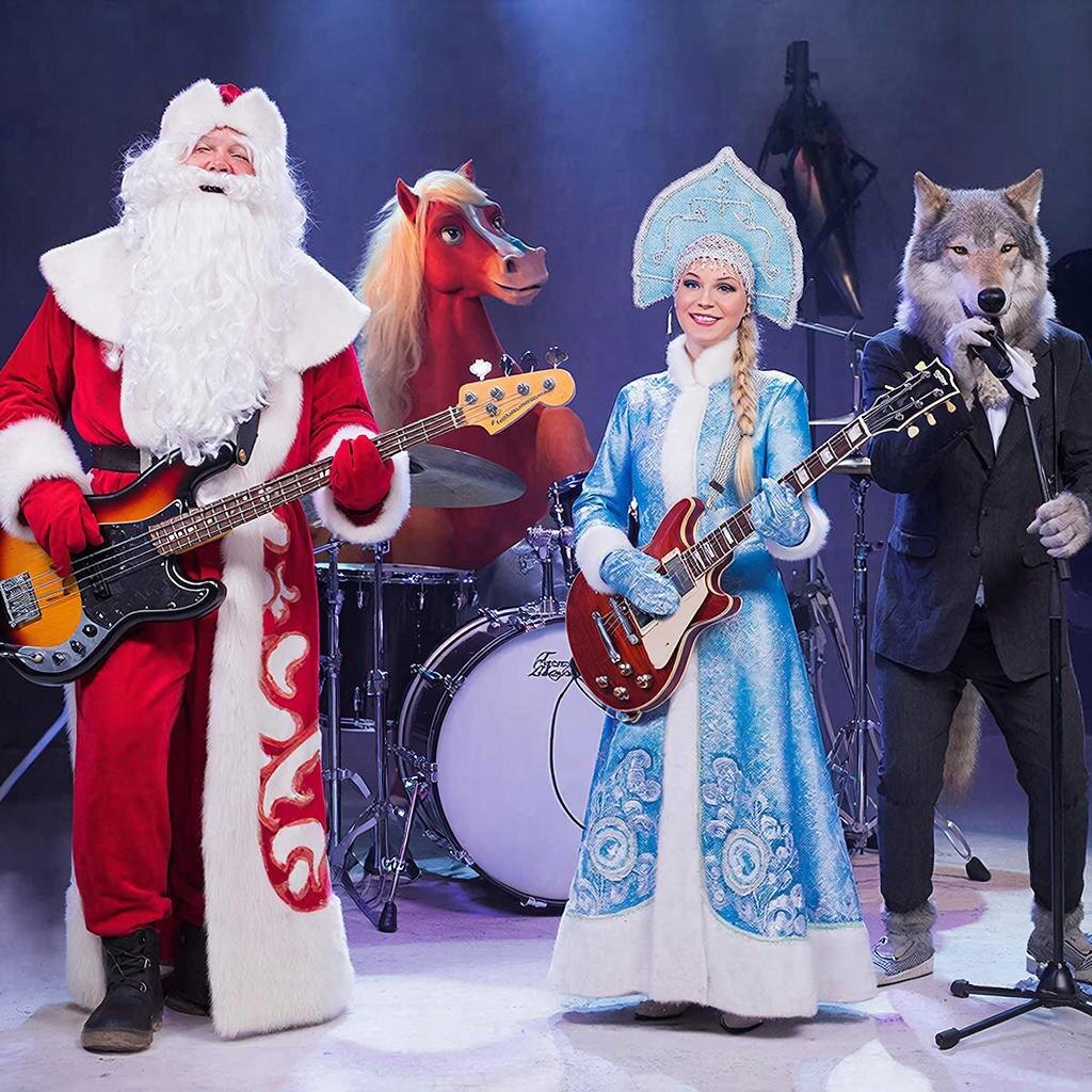 - За ударной установкой — красная лошадь с огненной гривой. Каждый взмах её копыт озаряет сцену алыми всполохами, а барабаны отзываются громом, будто раскаты новогоднего салюта. У микрофона — серый волк, его голос глубок и бархатист, словно зимний ветер, несущий сказки сквозь сосновые ветви.