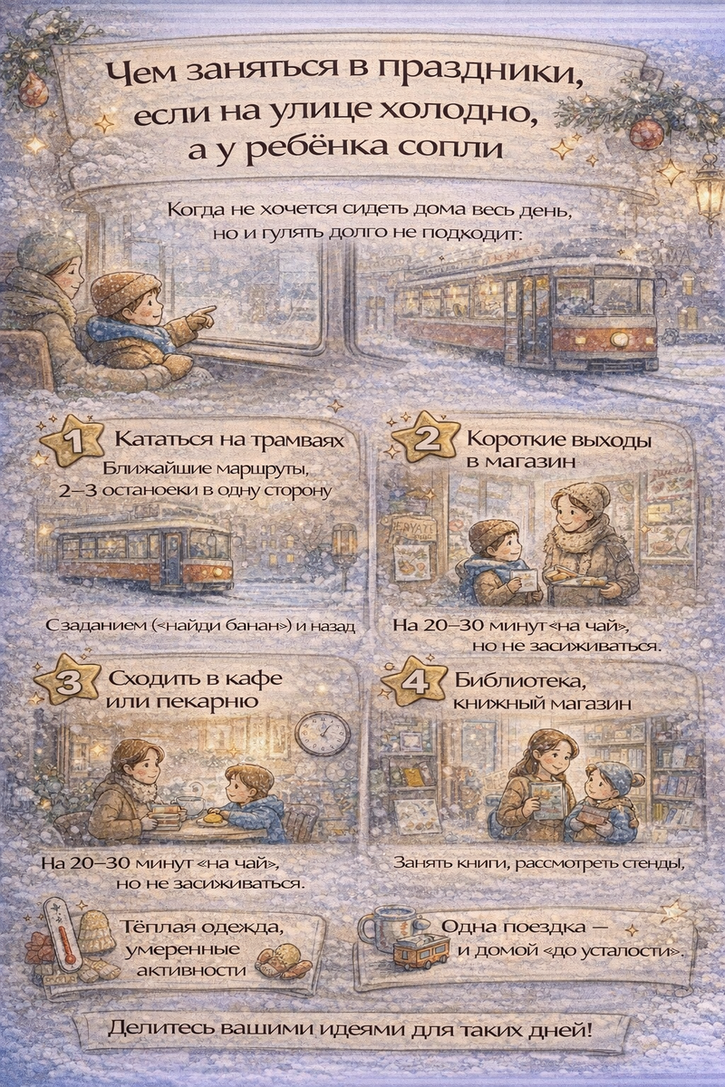 активности — да, переохлаждение и перегруз — нет. Ребёнку важно: Родителю важно: В этот раз мы выбрали неожиданно простой формат — поездки на трамваях. Почему это сработало: Для ребёнка это приключение: