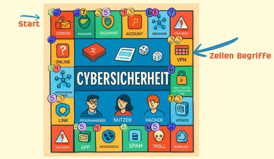 - Die Spieler bewegen sich durch Würfeln über das Feld. Auf jeder Zelle können sie Informationen zur Cybersicherheit erhalten oder eine Aufgabe ausführen.