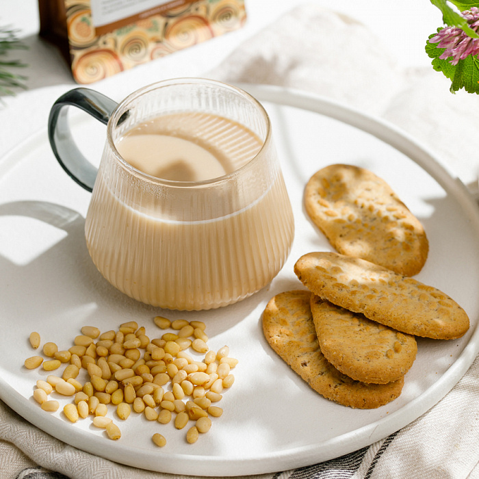 - Приготовление чистого кедрокофе: Это простой процесс, больше похожий на заваривание растворимого цикория. 1-2 чайные ложки порошка заливают горячей водой (80-90°C), но не кипятком, чтобы не допустить горечи. Настаивают 3-5 минут. Для лучшей экстракции и фильтрации мелкой взвеси идеально подойдет френч-пресс. Пить можно как в чистом виде, так и с добавлением молока, меда или специй вроде корицы.