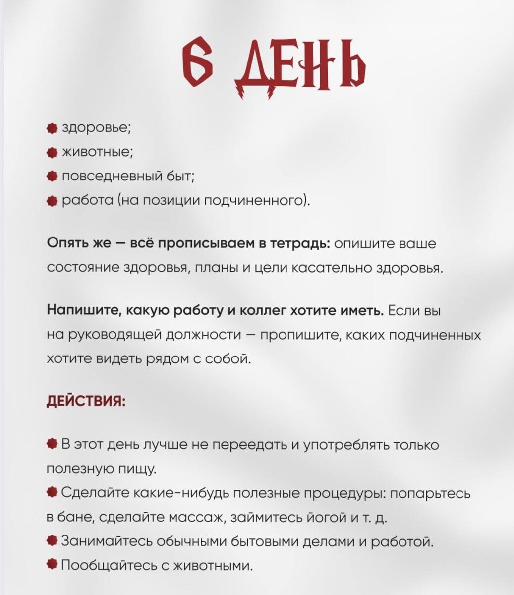 Сегодняшний день про то, что держит нас в реальности. Не про мечты и планы, а про опору. 6-й день связан с: — здоровьем — телом и самочувствием — повседневным бытом — работой и тем, в каком окружении вы трудитесь Это день честного взгляда: в каком состоянии сейчас ваше тело? как вы реально заботитесь о себе, а не «в идеале»? насколько ваша повседневная жизнь поддерживает вас, а не истощает? Сегодня важно прописать: — состояние здоровья и цели, связанные с телом — какие привычки вы хотите сохранить, а какие — пересобрать — в каком рабочем окружении вы хотите находиться — с какими людьми вам комфортно работать рядом Если вы руководитель — это день про команду. Про то, каких людей вы хотите видеть рядом с собой, какие качества для вас сейчас ключевые, и какие отношения в работе для вас норма. На уровне действий день очень простой и приземлённый: — не переедать, выбирать полезную еду — заняться телом: йога, массаж, баня, прогулка — навести порядок в быту — сделать обычные, земные дела