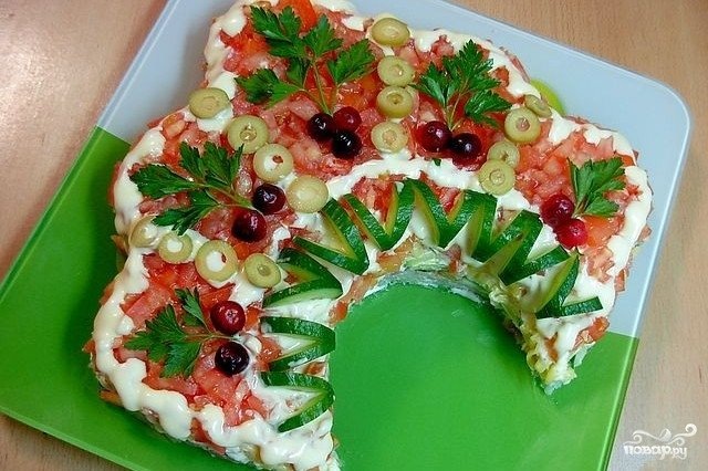 Назначение: На праздничный стол Блюдо: Салаты География кухни: Русская кухня 🍲 Порций: 8 | ⏱️ Время: 1ч. 0м. Салат Русская красавица - очень вкусный, популярный, эффектный салат, достойный вашего праздничного стола. Поведаю вам очень простой рецепт салата Русская красавица - разберется каждый. Описание приготовления: Рассказываю, как приготовить салат "Русская красавица": 1. Подготовим все ингредиенты. Картофель отварим до готовности, натрем на крупной терке. Ветчину нарежем небольшими кубиками или ломтиками. Огурец нарежем тонкими ломтиками. Яйца отварим вкрутую и натрем на крупной терке. Куриное филе отварим до готовности и разберем на волокна. Сыр натрем на крупной терке. Помидоры нарежем небольшими кубиками. Солим, перчим ингредиенты по вкусу. 2. Берем подходящую форму для салата (у меня есть специальная форма для этого салата, в виде кокошника, однако вы можете использовать любую другую). 3. Выкладываем слоями картофель, ветчину, огурец, яйца, куриное филе, сыр и помидоры. Кажды