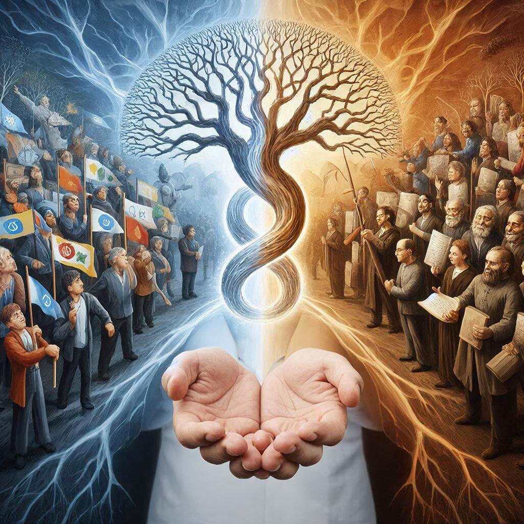 Иллюстрация работы принципа взаимодействия трёх сил. 1. Пассивное начало (подавляющее большинство): 2. Активное начало (малое меньшинство): 3. Третий элемент (арбитр): это не отдельная группа, а люди с особым типом мышления и поведения, которые есть в обеих частях общества. Они могут быть: Третий элемент выполняет функции арбитра и связующего звена: Когда активное меньшинство слишком агрессивно: Когда пассивное большинство впадает в застой: В состоянии баланса: Чтобы успешно выполнять роль арбитра, человек или группа должны обладать: В социальной системе третий элемент — это не отдельная каста, а роль, которую может играть любой человек, обладающий нужными качествами. Его миссия: Без третьего элемента общество либо застывает в застое (если доминирует пассивное большинство), либо разрывается конфликтами (если активное меньшинство навязывает изменения силой). С его появлением система обретает динамическое равновесие — способность развиваться без разрушения своей основы. 6.01.2026