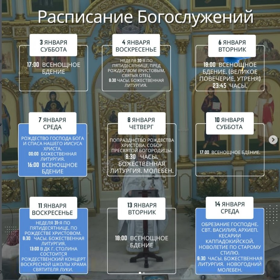 РАСПИСАНИЕ БОГОСЛУЖЕНИЙ 🔵6 января вторник 18:00 Всенощное бдение. (Великое повечерие, утреня) 23:45 Часы. 🔵7 января среда РОЖДЕСТВО ГОСПОДА БОГА И СПАСА НАШЕГО ИИСУСА ХРИСТА. 00:00 Божественная Литургия. 🔵7 января среда 16:00 Всенощное бдение. 🔵8 января четверг Попразднство Рождества Христова. Собор Пресвятой Богородицы. 8:30 Часы. Божественная Литургия. Молебен. 🔵10 января суббота 17:00 Всенощное бдение. 🔵11 января воскресенье Неделя 31-я по Пятидесятнице, по Рождестве Христовом. 8:30 Часы. Божественная Литургия. 13:00 в ДК г. Столина состоится Рождественский концерт Воскресной школы храма святителя Луки. 🔵13 января вторник 18:00 Всенощное бдение. 🔵14 января среда Обрезание Господне. Свт. Василия, архиеп. Кесарии Каппадокийской. Новолетие по старому стилю. 8:30 Часы. Божественная Литургия. Новогодний молебен. 🔵17 января суббота 17:00 Всенощное бдение. 🔵18 января воскресенье Неделя 32-я по Пятидесятнице, по Богоявлении. ( День постный ) 8:30 Часы. Божественная Литур