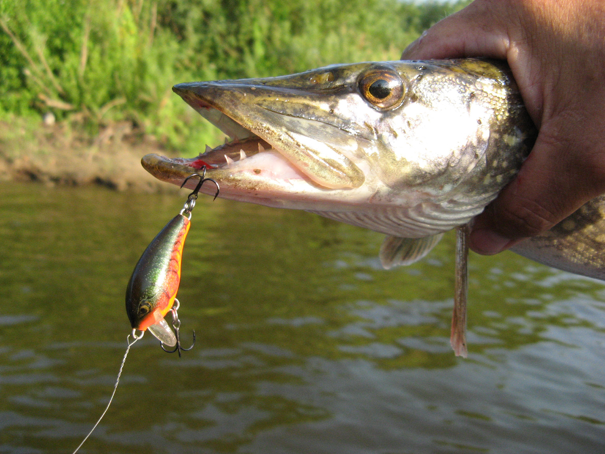 Не знаю, ловит ли кто-то сейчас на подобные воблеры, в нескольких интернет-магазинах я его в наличии не обнаружил. А 25 лет назад, «на безрыбье», вполне себе «Рапала» пользовалась нашим вниманием. В том числе – вот такая, ультралайтовая. Опять же, четверть века назад мы плохо знали, что там все эти буковки на упаковке означают, и в результате этой безграмотности я вместо плавающего воблера купил… тонущий. Проверял уже на реке: выплыл на лодке и «положил воблер на воду». А он не положился совсем, просто стал быстренько тонуть! Каким-то невероятным образом я его в толще воды сумел поймать – и только тогда понял, что это совсем не «флутинг», а «синкинг». Никакого фурора среди голавлей воблер не произвёл, хотя останься он у меня до сей поры, наверняка бы поймал. А так – только фотка с щучкой нашлась. Наверняка ещё окуни были, но до 2004 года у меня и цифрового фотика не имелось, а воблер был куплен и разловлен где-то двумя годами ранее…