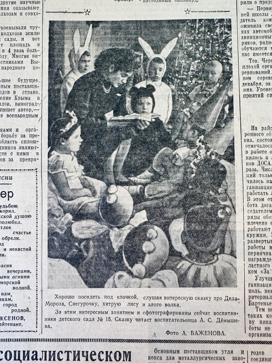 🗞️ «Хорошо посидеть под елочкой, слушая интересную сказку про Деда Мороза, Снегурочку, хитрую лису и злого волка. За этим интересным занятием и сфотографированы сейчас воспитанники детского сада №15. Сказку читает воспитательница А. С. Дёмышева», — писали в газете. Фото: А. Баженов 📰 Слава Севастополя
