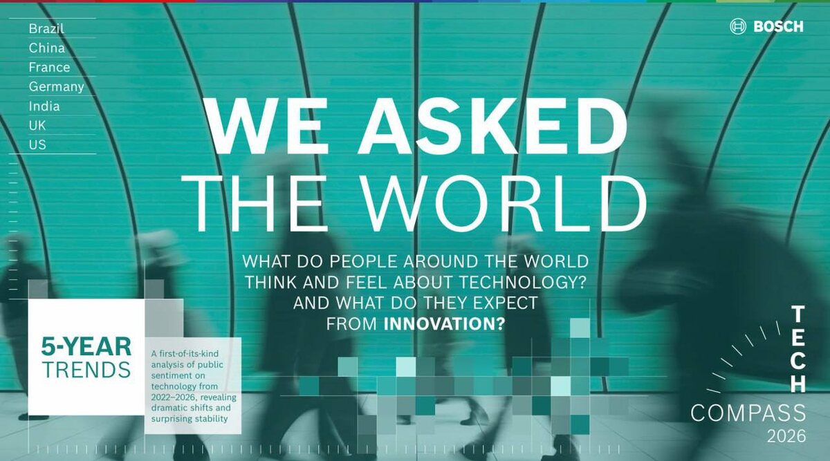 ⸻ Мир не против технологий. Он против скорости без смысла. Вышел отчёт Bosch Tech Compass 2026 — масштабное исследование отношения людей к технологиям за последние 5 лет (2022–2026). 11 000+ респондентов, глобальный срез, без футуристической истерики — только факты. Вот что показалось мне важным. 1. Запрос не на «быстрее», а на «осознаннее» 57% людей считают, что технологический прогресс стоит замедлить, пока мы лучше не поймём его последствия . 2. ИИ — технология №1 ближайшего десятилетия За 5 лет отношение к ИИ радикально изменилось: с 43% в 2022 до 70% в 2026 — столько людей считают ИИ самой влиятельной технологией будущего . Но парадокс в том, что ИИ одновременно: — самый большой источник надежд — и один из главных источников тревоги 3. Самое влиятельное изобретение последних 20 лет — не ИИ 60% называют смартфон главным технологическим изобретением эпохи . 4. Люди ждут технологий для жизни и здоровья Половина респондентов хочет видеть инновации прежде всего: — в персональ