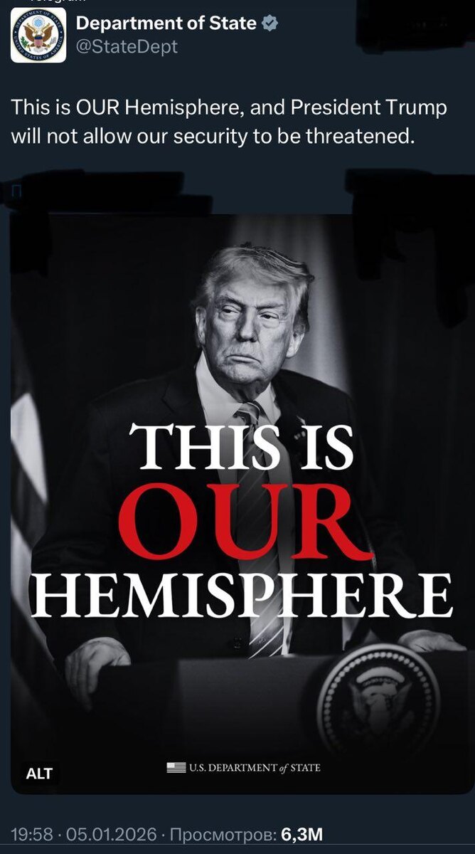 Госдепартамент в официальном сообщении в соцсети X заявил, что Западное полушарие Земли отныне является исключительной зоной интересов США. В американском внешнеполитическом ведомстве указали, что президент США Дональд Трамп не допустит возникновения угроз для безопасности страны. «Это наше полушарие, и президент Трамп не допустит угроз нашей безопасности», – говорится в сообщении. Твит сопровождается черно-белым изображением президента Дональда Трампа и крупной надписью «Это НАШЕ полушарие». Госсекретарь США Марко Рубио уже выступал с похожим заявлением 4 января, на следующий день после американской операции «Абсолютная решимость» в Венесуэле, в ходе которой были захвачены президент Николас Мадуро и его супруга Силия Флорес. «Это Западное полушарие. Здесь мы живем — и мы не позволим Западному полушарию стать оперативной базой для противников, конкурентов и соперников Соединенных Штатов», — заявлял Рубио. Ранее Трамп на фоне своей операции против Венесуэлы призвал не забывать о доктр