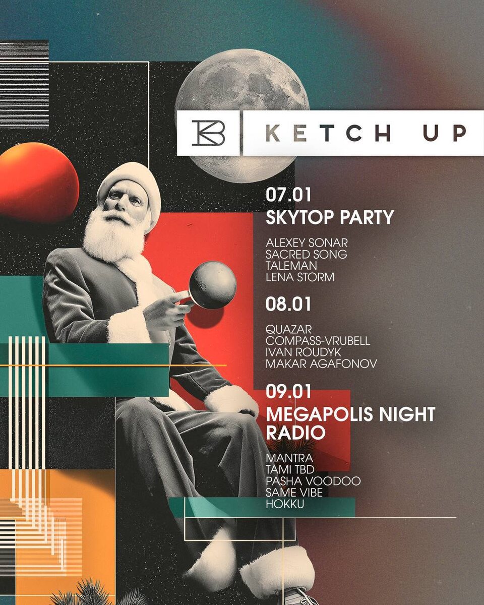! 07.01 Skytop Party Alexey Sonar Sacred Song Taleman Lena Storm 08.01 Residents Quazar Compass-Vrubell Ivan Roudyk Makar Agafonov 09.01 Megapolis Night Radio Mantra Tami TBD Pasha Voodoo Same Vibe Hokku FC | DC 21+ 🎫 Вход свободный 8 800 444 2 444 🕖 23:00 - 6:00 📍Ketch Up, Москва, Кузнецкий Мост 6/3Up!