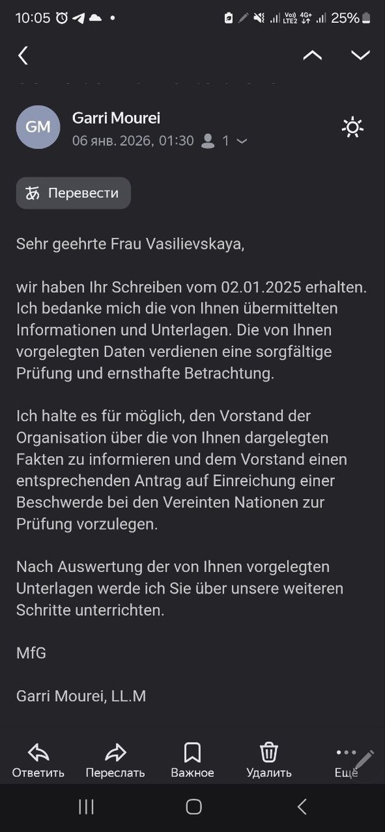 ‼️По инициированной жалобе о присутствии иностранных наёмников на территории Украины в рядах ВСУ мне пришло письмо ЛИЧНО от главы Европейского Информационного Центра по Правам Человека (EIHRC) Все документы и сведения уже на проверке под его личным контролем. 🌟Сила в Правде. Кто прав, тот и сильнее. "06 янв. 2026 Перевод Уважаемая г-жа Василевская, мы получили Ваше письмо от 02.01.2025. Благодарю Вас за переданную информацию и предоставленные документы. Представленные Вами данные заслуживают тщательной проверки и серьёзного рассмотрения. Я считаю возможным проинформировать правление организации о изложенных Вами фактах и внести на рассмотрение правления соответствующий запрос о подаче жалобы в Организацию Объединённых Наций. После изучения предоставленных Вами материалов я сообщу Вам о наших дальнейших шагах. С уважением, Гарри Мурей, магистр права" 💎 МУРЧЕЛЛО КРЕМЛЯ