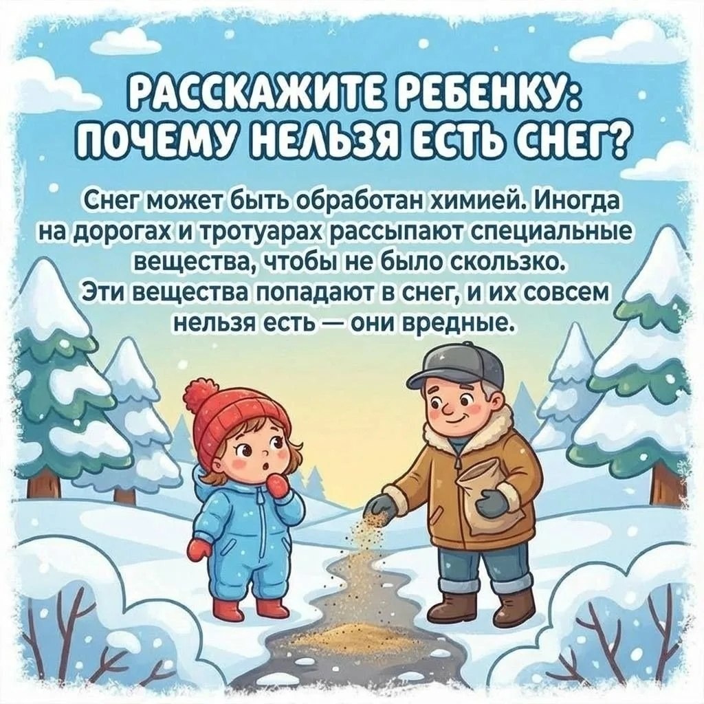 ? Дорогие родители и малыши! Сегодня мы хотим напомнить вам важную вещь: снежинки красивые, но кушать их не стоит! Вот почему: Снег грязный. Даже самый белый снег собирает пыль, грязь и вредные вещества из воздуха. Холодно и опасно. Холодный снег может вызвать боль в горле и даже простуду. Можно заболеть. Бактерии и микробы тоже любят прятаться в снегу. Давайте будем дружить со снегом иначе: лепить снеговиков, строить крепости и кататься на санках!Пусть прогулки зимой будут веселыми и здоровыми! Помните, забота начинается с маленьких шагов! Будьте здоровы и берегите себя и ваших близких!
