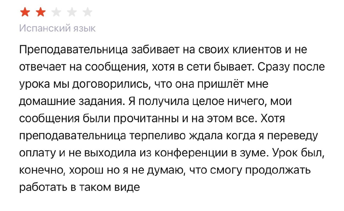 🌞 Дорогие Ученики, при каких условиях Вы не станете продолжать заниматься с Учителем, даже если его занятия Вас устраивают? Внизу делится мнением ученица, которая искала репетитора по испанскому: «Добрый вечер! Хочу поделиться историей и скрином своего отзыва:) В 2023 году я захотела изучать испанский и решила найти репетитора. Списалась с одним и запланировала встречу, которая прошла отлично. Но женщина перестала выходить на связь уже на следующий день, лишь коротко сообщив что болеет. В сети она бывала регулярно, но за неделю (целую неделю, Карл!) не прислала дз и не выслала мне учебный материал» Справедливо ли оставлен отзыв? Или, возможно, ученице следовало просто прекратить занятия, не оставляя его?