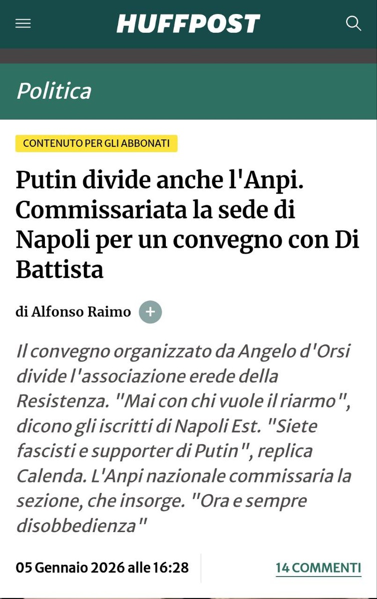 Resistere ai resistenti. La sezione Aurelio Ferrara dell’Anpi di Napoli è sulle barricate. L’Associazione nazionale partigiani italiani ha deciso di commissariarla con accuse pesanti: “Mettete in discussione l’immagine e la dignità dell’Anpi”, hanno scritto da Roma. Per i resistenti napoletani che si rifanno alla memoria di Ferrara, anima delle Quattro giornate, non ci stanno. “Disobbediremo. Non riconosciamo questo commissariamento”. È il putinismo, vero o presunto, a mettere gli eredi dei partigiani gli uni contro gli altri. La pietra dello scandalo è il convegno organizzato prima di Natale da Francesco Specchio, presidente della sezione Anpi Napoli orientale alla Federico II. Titolo “Russofilia, russofobia, verità”. Ospiti Alessandro Di Battista, ex parlamentare M5s e fondatore dell’associazione Schierarsi, e Angelo D’Orsi, storico, direttore della rivista Historia Magistra. Nota bene: è la tappa napoletana dei convegni che D’Orsi sta organizzando in tutta Italia per offrire un p