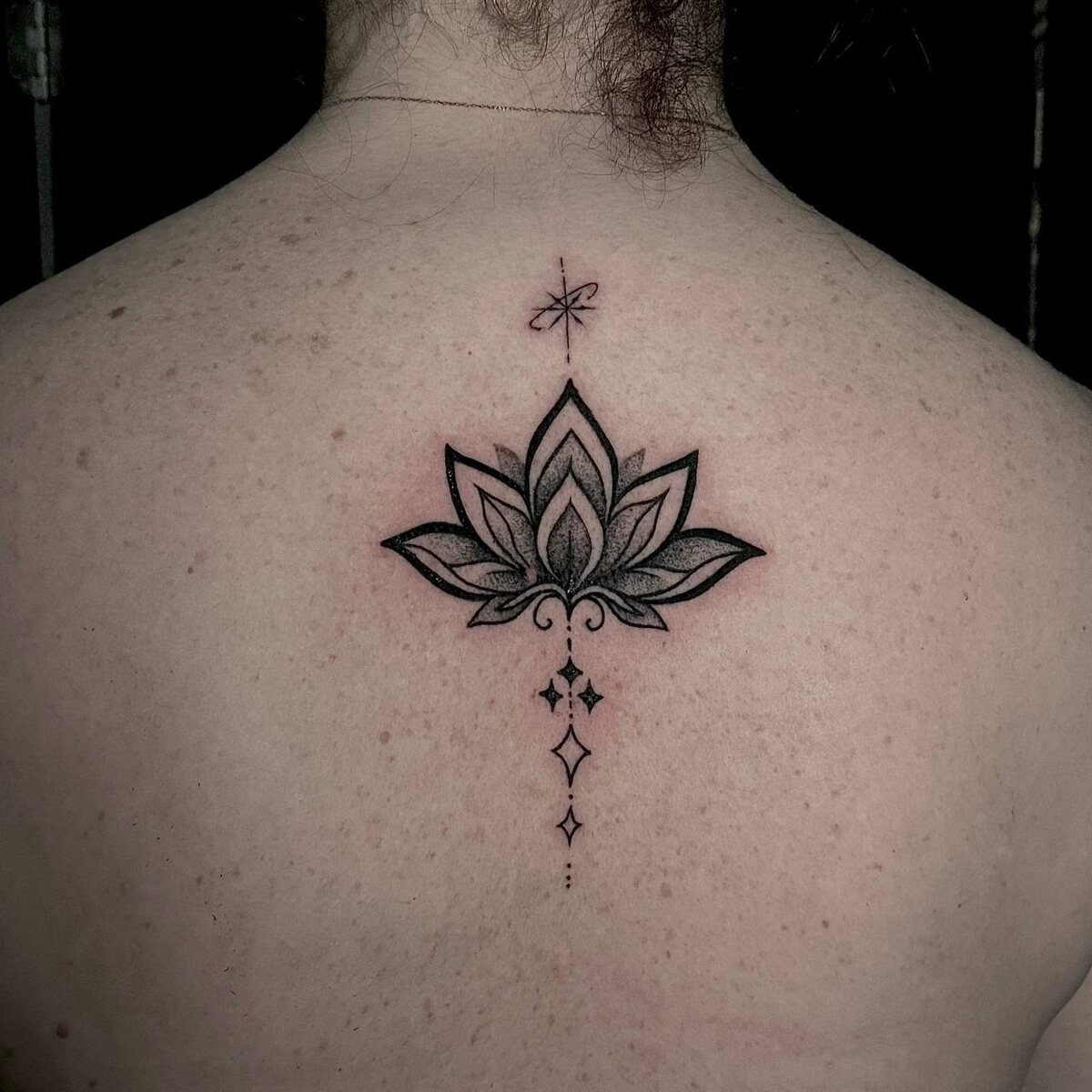 Августина. 12000 ₽. Почему лотос? Потому что он вырастает из грязи и становится идеальным. Это реально, не метафора. В иконографии это символ трансформации. И люди выбирают его потому что понимают про себя. Как это делается? Августина рисует эскиз. Вы смотрите как это будет выглядеть на вашей спине. Согласуете. Потом примерно 3-4 часа — и готово. 🔗 Запись: Арбат Академическая #татуМосква #мастерАвгустина #лотос #спина #миртату