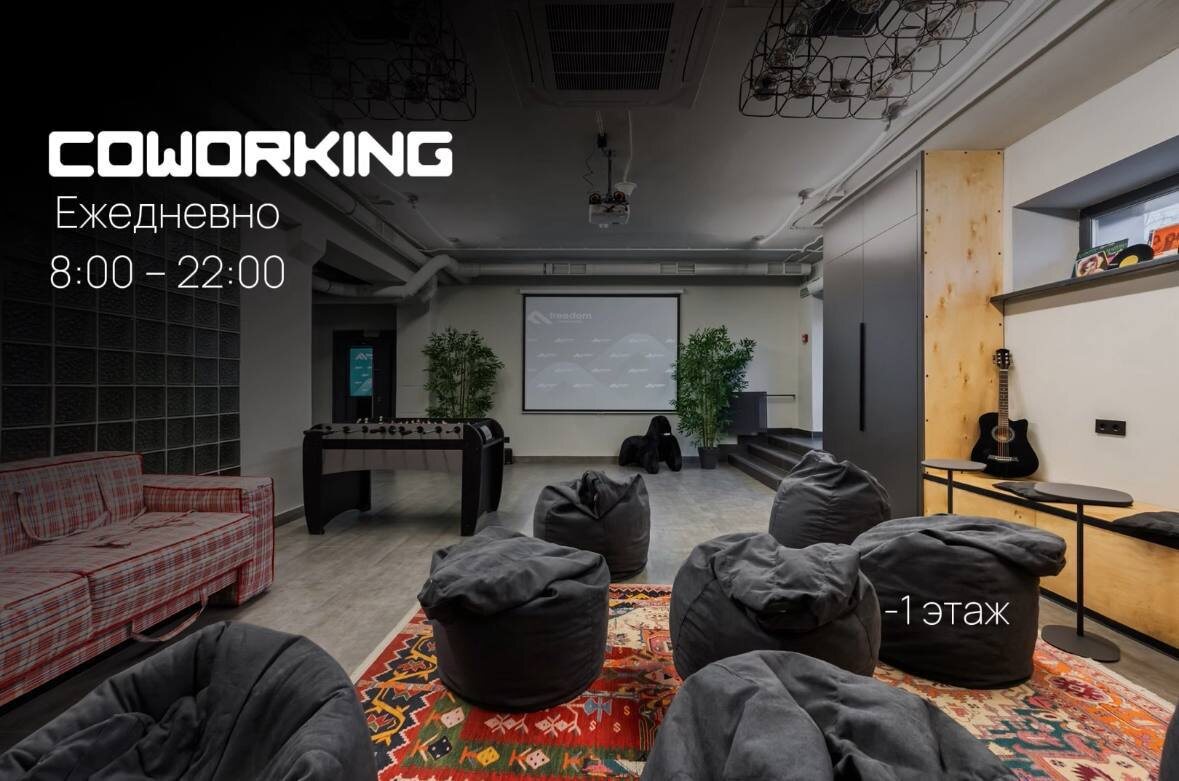 » Ломаем стереотипы! Одно пространство — множество возможностей. БЕСПЛАТНО для всех! Гости отеля могут использовать это пространство для работы, отдыха и ожидания. Жители и гости города — для своих небольших встреч и мероприятий. Территория частично проходная: через коворкинг можно пройти в конференц-зал, переговорную и подкостную. Ежедневно для гостей отеля в 20:30 — показ фильмов 🍿🎬. Режим работы: ежедневно с 8:00 до 20:00. Вместимость: до 20 человек. Площадь: 80 м². Расположение: –1 этаж апарт-отеля Freedom, ул. Комвузовская, 21В. Удобства: · есть отдельный вход с улицы; · гардеробный шкаф; · кулер с водой; · рядом — кофейная точка; · санузел (3 кабинки); · бесплатный Wi-Fi; · парковка; · охрана и видеонаблюдение; · стильный дизайн; · 2 сценария освещения. Оснащение: 🟢 большой экран и проектор для кинопоказов; 🟢 стильный диван; 🟢 трёхэтажный подиум с мягкими подушками; 🟢 пуфики — 8 шт.; 🟢 4 рабочих столика для ноутбуков. Правила использования: ➡️ бронирование: для п