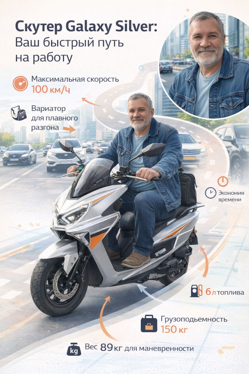 В мире, где пробки стали нормой, а мобильность — ключом к успеху, выбор надежного транспорта играет решающую роль. Если вы ищете скутер Galaxy Silver 150 см³, то эта статья для вас. Мы разберем его характеристики, преимущества и реальные сценарии использования. Этот скутер 150 см³ от бренда Техномоторф сочетает стиль, мощность и удобство, делая его отличным выбором для тех, кто хочет купить скутер для ежедневных поездок или выходных вылазок. Давайте разберемся, почему Galaxy Silver заслуживает вашего внимания. Galaxy Silver — это современный скутер с бензиновым двигателем 150 см³ (фактически 49,9 см³ для соответствия нормам), который развивает максимальную скорость до 100 км/ч. Он оснащен 4-тактным мотором, вариатором для плавного разгона и электростартером для легкого запуска. Вес всего 89 кг делает его маневренным, а грузоподъемность 150 кг позволяет перевозить пассажира или покупки. Объем топливного бака — 6 литров, что обеспечивает хороший запас хода. Цвет серебро добавляет элеган