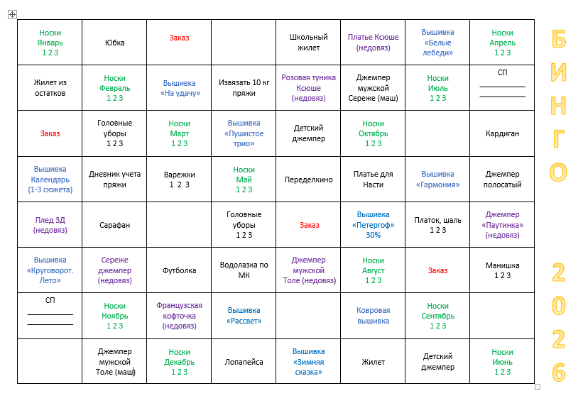 В последний момент вставила такие клетки, как УЧЕТ ПРЯЖИ и ИЗВЯЗАТЬ 10 КГ ПРЯЖИ. В прошлом году извязала 11 кг 816 грамм. Надеюсь, что и в этом году получится. Хотелось еще НЕ ПОКУПАТЬ ПРЯЖУ И ВЫШИВКУ, но это точно не про меня.