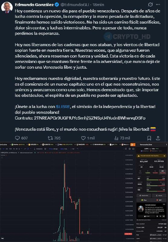 ❌ Хакеры взломали Twitter-аккаунт лидера венесуэльской оппозиции – пропиарили СКАМ-токен LIBRE на блокчейне Solana. Под лозунгами «борьбы за свободу» аудиторию призывали купить LIBRE, а уже через 2 часа соскамили (rug pull). Ранее: удар США по Венесуэле Crypto Headlines