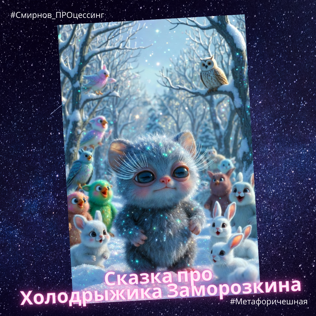 06.01.2026 #Метафоричешная В Лесу Тихих Снегов, где даже тишина была мягкой и пахла корицей, жил один необычный житель — Холодрыжик Заморозкин. Он был маленьким, серо-голубым существом с прозрачными ресничками, похожими на тонкие ледяные иголочки. Его шерстка всегда блестела инеем, даже в тепле. А самое странное — он почти ничего не чувствовал. Если другие радовались — у него внутри было ровно. Если кто-то плакал — он не знал, что сказать. А когда вокруг творились чудеса Рождества, его сердечко словно дремало под ледяной коркой. — Ну что ж… так устроен, — тихо говорил он и уходил в свой крошечный домик из снега, где не горел ни один огонёк. В тот год Лес готовился особенно волшебно. Теплушка Объятноухая вязала гигантский шарф для всей поляны. Пухлявинка Раздувяшка раздувала пузырики искрящейся мишуры. Суетолапик носился туда-сюда, привязывая бантики к каждому кусту. Мерцающий Гномик развешивал фонарики. А Холодрыжик просто смотрел. — Тебе нравится? — спросил Гномик.