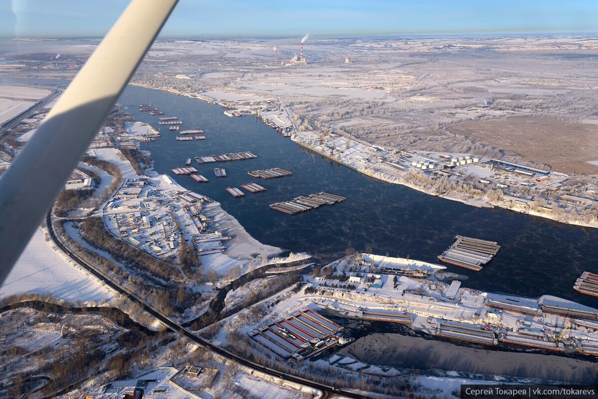 Зимняя стоянка барж на Енисее в районе Песчанки. Вид из