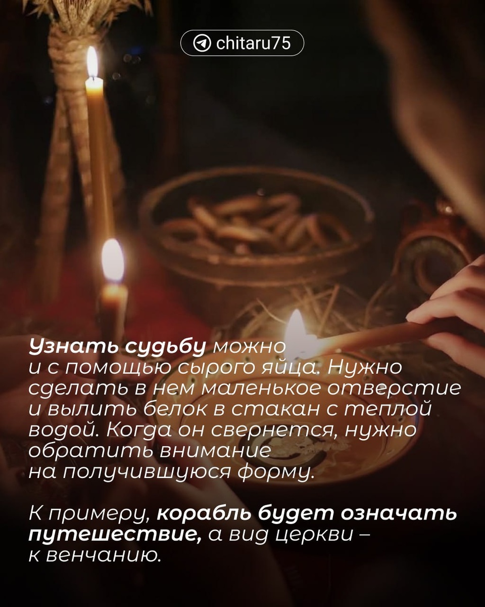 Сегодня же проходит Рождественский Сочельник. В этот же день начинаются святки, и продолжаются они до Крещения — до 19 января. 💬 Многие думают, что в эти дни лучше всего гадать. Люди пытаются узнать, каким будет год: урожай, личная жизнь, здоровье, финансы. Для гаданий используют свечи, бумагу, валенки, расчёску, зеркало, кольца и другие предметы. Способов много. Считается, что ночь с 6 на 7 января и весь период святок дают самые точные предсказания. Способы гадания, которые можно попробовать дома, чтобы узнать, что вас ждет в новом году. ⬇️