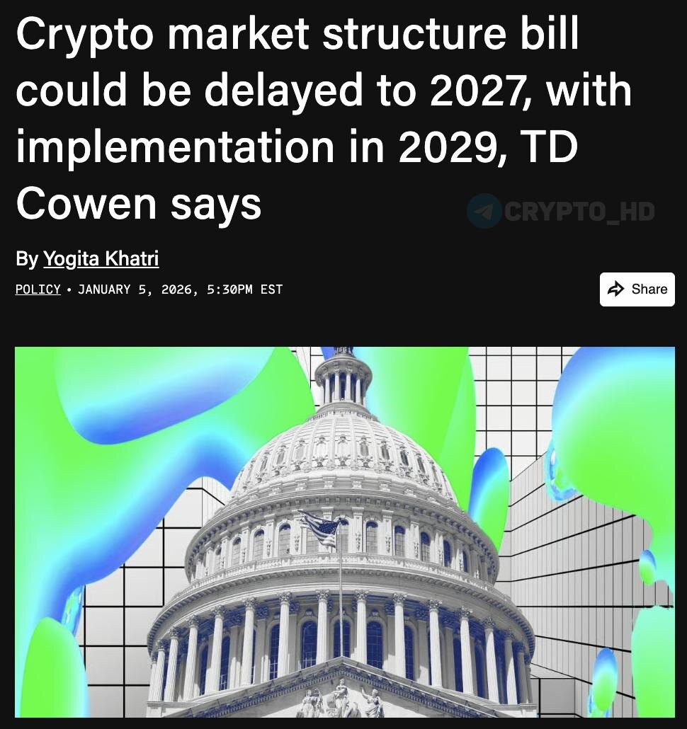 В TD Cowen считают, что принятие ключевого закона о регулировании крипторынка может сдвинуться на 2027 год, а его реальное внедрение на 2029-й. Причина – демократы тянут с голосованием до выборов 2026 года из-за споров о конфликте интересов вокруг Дональда Трампа и его крипто-бизнесов. Ранее: законопроект Crypto Headlines