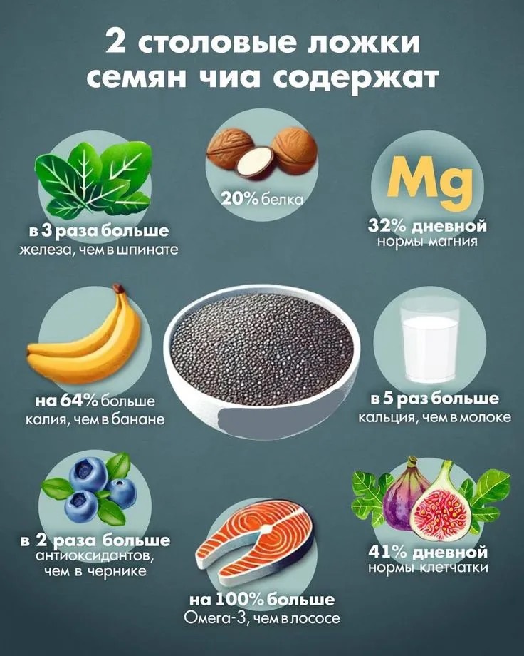 Семена чиа входят в число лидеров по содержанию омега-3 среди растительных продуктов. Эти жирные кислоты поддерживают здоровье сердца, сосудов и кожи, а ещё участвуют в снижении воспалительных процессов в организме. Особенно актуально для тех, кто редко ест рыбу или придерживается растительного питания.