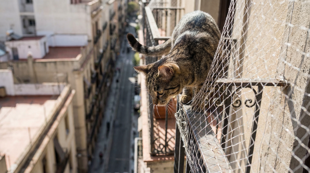 Перила, стеклянные ограждения, узкие щели между прутьями — всё это не защита. Кошка пролезет в щель шириной пять сантиметров. Перепрыгнет через перила высотой метр. Разобьёт тонкое стекло, если испугается или погонится за птицей. Единственное, что реально работает — сетка, натянутая от пола до потолка балкона, без единого зазора.