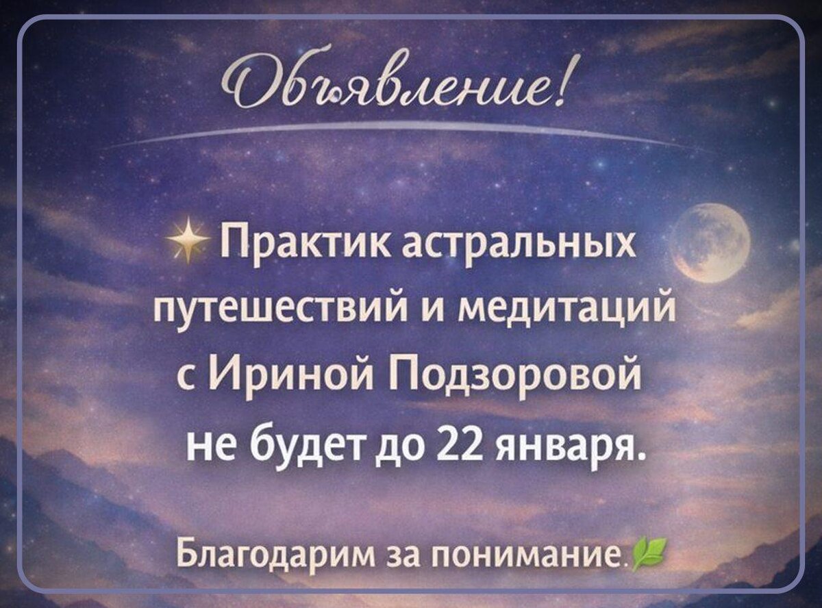 ! ‼️ Практик астральных путешествий и медитаций с Ириной Подзорововой не будет до 22 января. ✨ При этом вы всегда можете получить доступ к записям уже прошедших практик — медитаций и астральных путешествий, доступных в любое удобное для вас время. 👉 Перейти на страницу с практиками и получить записи: https://podzorova.academy/praktiki Благодарим за понимание и желаем вам глубоких и осознанных состояний 🌿