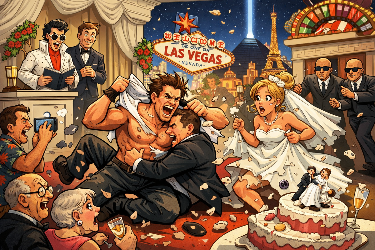 Теория о постановке имела право на жизнь. Лас-Вегас — город развлечений, и его жители овладели искусством превращения жизни в шоу на уровне, который восточным мистикам и не снился. Здесь граница между реальностью и представлением размыта настолько, что даже местные порой путаются. Свадебная индустрия города особенно изобретательна: тебе могут предложить венчание на американских горках, под водой в аквариуме с акулами или в вертолёте над Гранд-Каньоном. На этом фоне рестлинг-шоу в середине церемонии выглядит почти традиционным.