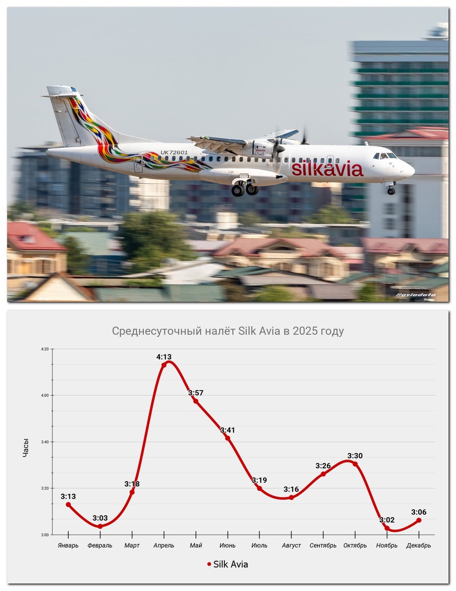 В 2025 году все самолёты авиакомпании налетали вместе 10854 часа. Из них ATR 72-600 провели в воздухе 9243:55 часа, а Let L-410 - 1610:05 часов. Как менялся среднесуточный налёт в течении года показано на графике. Заметна тенденция к уменьшению итак небольшого показателя налёта. Флот авиакомпании в прошедшем году пополнился только одним бортом Let L-410 - UK41004. Очень долгие простои самолётов при проведении технического обслуживания: UK72601 стоит с октября; UK72602 простоял суммарно 3 месяца в году; UK72603 стоит с марта; UK41001 простоял с января по сентябрь; UK41002 стоит с сентября; UK41003 стоит с декабря; После того как авиакомпания перешла под управление Uzbekistan Helicopters никакого развития не наблюдается. Как самолётов, так и выполняемых рейсов должно быть в разы больше, а мы как пассажиры видим только стагнацию и увеличение цен на билеты. #статистика #silkavia #итоги2025