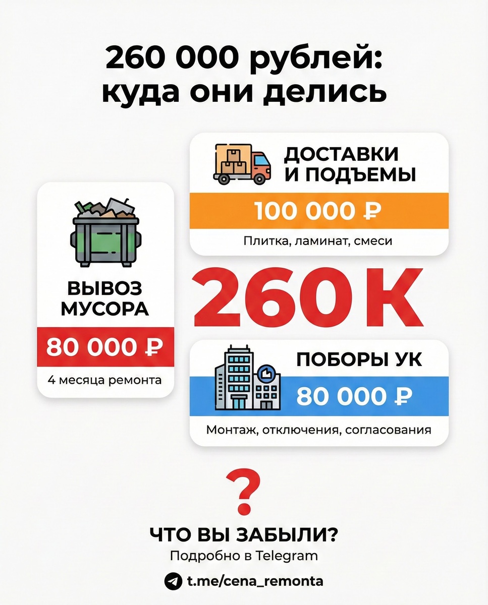 🔴 Второй «убийца» бюджета: Доставки и подъемы материалов (~100 000 ₽)