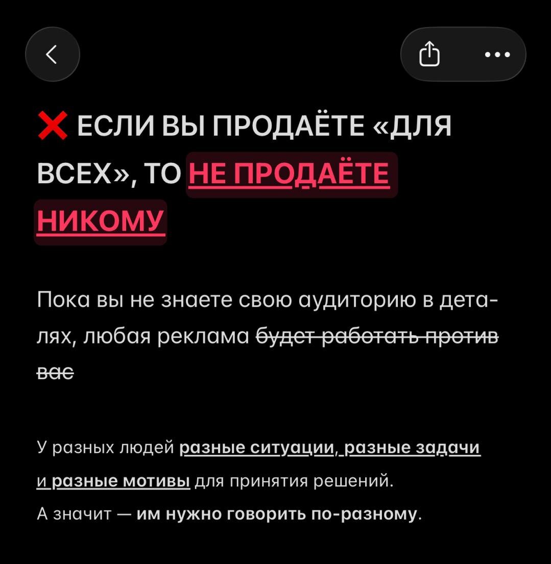 Как будто перед ними один и тот же человек с одинаковыми потребностями. ⠀ ❌ Это грубейшая ошибка. ⠀ Она про отсутствие выбора сегмента аудитории. У разных людей разные ситуации. Разные задачи. Разные мотивы купить. А значит — говорить с ними надо по разному. ⠀ Люди покупают не продукт. Они покупают РЕЗУЛЬТАТ. Продукт — это инструмент для выхода из конкретной ситуации.