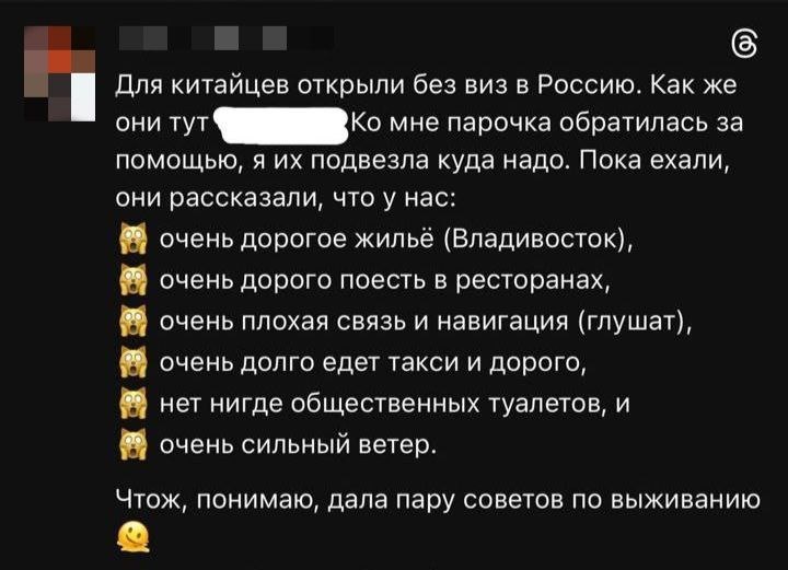 ϟ ПОДРОБНОСТИ... Гости из Китая, прибывающие в соседнее Приморье по безвизовому режиму, активно делятся впечатлениями от поездки — и многие из них признаются, что не ожидали таких расходов. По словам туристов, во Владивостоке высокие цены на жилье, рестораны и такси, из-за чего путешествие обходится заметно дороже, чем планировалось. Дополнительное недоумение вызывают перебои со связью и сильные ветры, которые не добавляют комфорта во время прогулок по городу. А нам тут ещё жить... ➡️ Подписаться - @KHV_NEWS