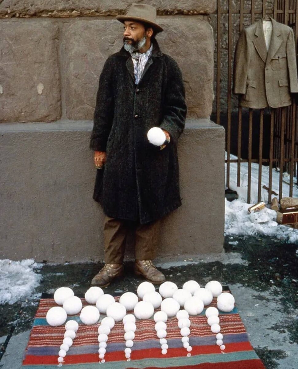 В 1983 году художник Дэвид Хэммонс провёл в Нью-Йорке перформанс «Распродажа снежков»: в морозный день он вышел на улицу и, как обычный уличный торговец, продавал снежки по одному доллару за штуку. Этот на первый взгляд абсурдный жест стал тонким и жёстким высказыванием о ценности искусства, расовом неравенстве и хрупкой, ускользающей природе самого существования. Используя самый обыденный и мимолётный материал, Хэммонс превратил улицу в пространство глубокого социального комментария. Фотограф Дауд Бей зафиксировал этот момент, и благодаря его кадрам перформанс обрёл визуальную форму, став одной из самых знаковых и провокационных работ в творчестве Хэммонса. Именно эти фотографии сыграли важную роль в признании Хэммонса как выдающегося художника, способного через простое действие говорить о сложном — и болезненно актуальном. «Распродажа снежков» осталась в истории не как сделка, а как вопрос — о том, что мы готовы считать ценным, кто назначает цену искусству и что происходит с ним, ко