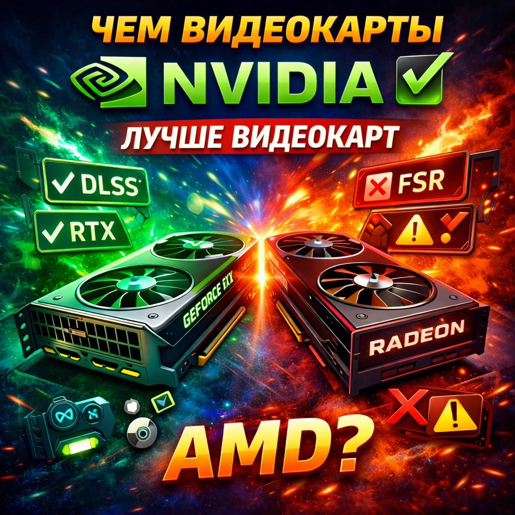 Споры между Nvidia и AMD не утихают уже много лет 🔥. Одни выбирают Radeon из-за цены, другие остаются верны GeForce. Но если отбросить фанатизм и посмотреть на факты, становится понятно, почему именно видеокарты Nvidia чаще всего выбирают геймеры, стримеры и создатели контента. В этой статье разберем, в чем реальные преимущества Nvidia перед AMD и почему во многих сценариях GeForce оказывается более универсальным выбором. Одно из главных преимуществ Nvidia это драйверы. Что важно: AMD за последние годы сильно подтянулась, но проблемы с драйверами все еще встречаются чаще, особенно в новых релизах и нестандартных конфигурациях. DLSS это один из ключевых козырей Nvidia. Почему DLSS лучше: У AMD есть FSR, но он работает на алгоритмах масштабирования и почти всегда уступает DLSS по четкости и стабильности картинки. Если ты играешь с трассировкой лучей, Nvidia вне конкуренции. Преимущества Nvidia в RTX: На видеокартах AMD рейтрейсинг часто превращается в компромисс между красотой и произво