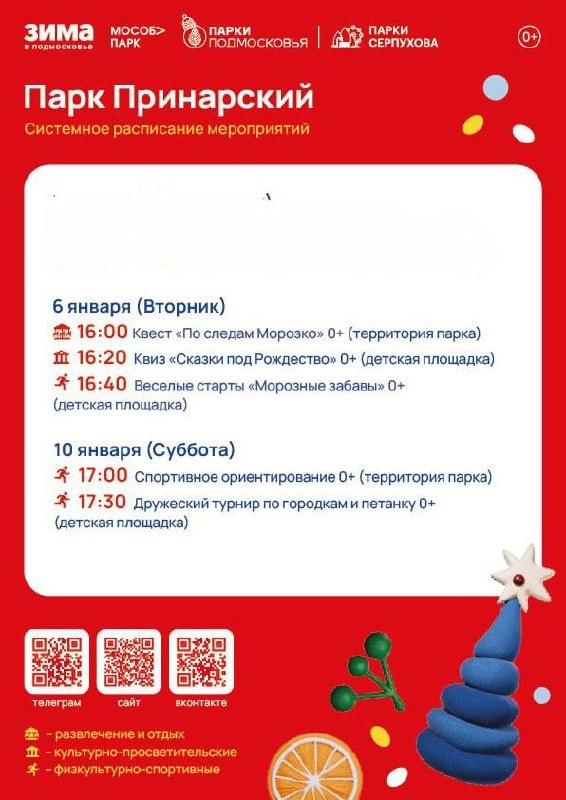 ✨ Пойдём сегодня в Принарский парк? 😍 В 16:00 Квест, квиз и веселые старты. Все, что очень любят дети 💝 И наметьте в планы на 10 января тоже прийти в парк 🚫 Возраст: 0+ 🏢 Парк "Принарский" 📍 г. Серпухов, Театральная ул. 💰 Вход свободный❗️ ⭐Поддержать канал голосом 💰 Канал Вакансии Серпухова ✅ Мероприятия Серпухов https://dzen.ru/id/66f01c6eb4c6fe60c9ca1608 http://vk.com/serpukhov_events http://dzen.ru/serpukhov_events
