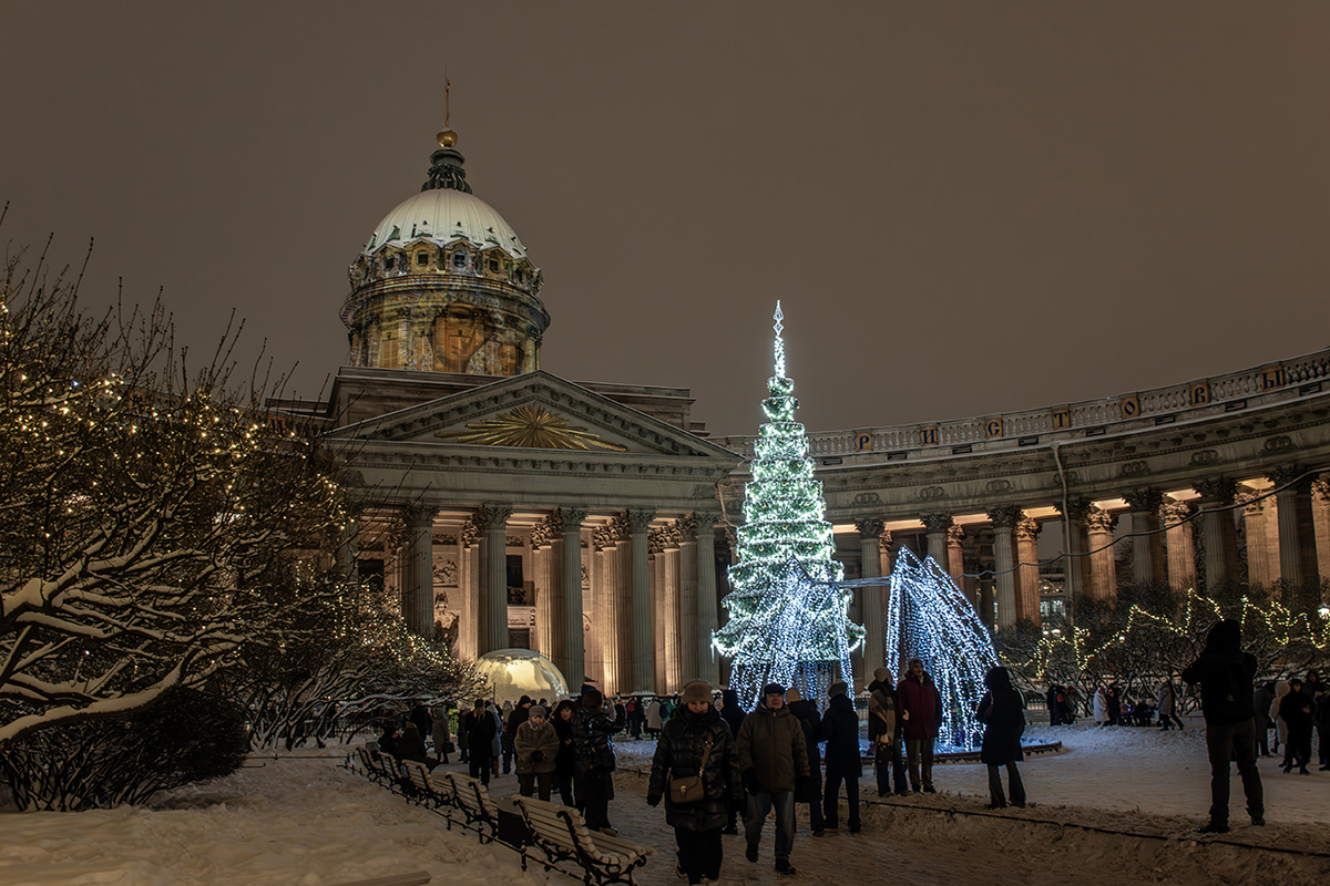 У Казанского собора в Санкт-Петербурге традиционно устанавливают рождественский вертеп в виде прозрачной стеклянной сферы. В этом году в январе начались сильные морозы и снегопады. Стеклянная сфера покрылась снегом и льдом. Но все равно здесь всегда много посетителей.