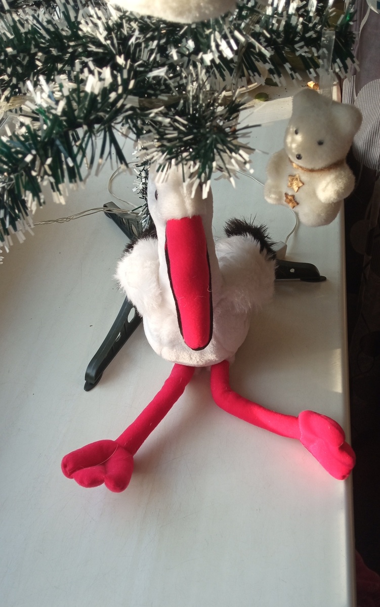Мама решила подшутить и положила аиста под елку вместо деда мороза )), причем забавно он так сидит. Этого аиста подарил поклонник 2 года назад, тоже на новый год 😀.