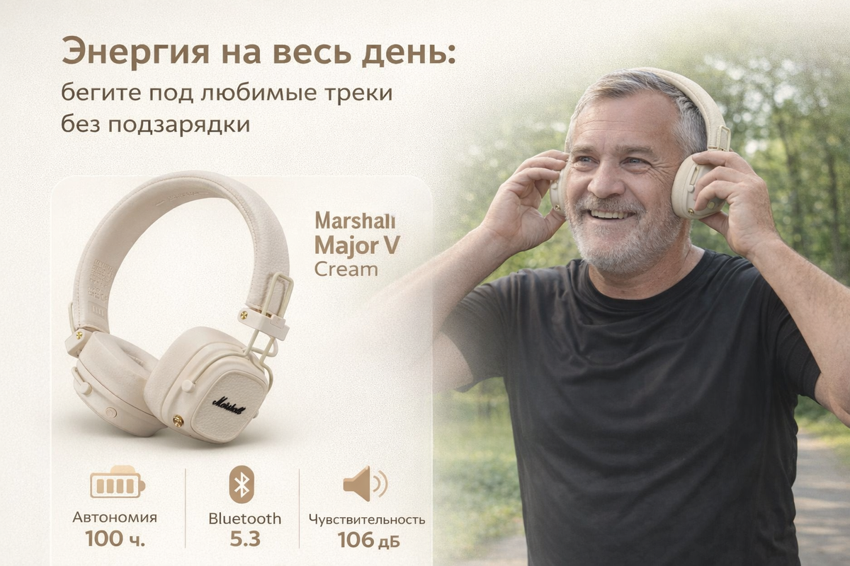 Наушники Marshall Major V Cream — это воплощение классического стиля бренда Marshall, известного своими гитарными усилителями. Бежевый цвет (Cream) делает их не просто устройством, а стильным аксессуаром, который подойдёт к casual-образу или офисному луку. Полноразмерная конструкция с оголовьем обеспечивает удобную посадку, а мягкие амбушюры и вес всего 186 граммов позволяют носить их часами без усталости. Но что делает их по-настоящему комфортными? Складная конструкция для удобного хранения, регулировка громкости прямо на чашках и неодимовые магниты для чистого звучания. Чувствительность 106 дБ и импеданс 32 Ом гарантируют, что музыка будет звучать ярко и детально, от 20 Гц до 20 000 Гц. Без активного шумоподавления (ANC), но с закрытым акустическим оформлением, они отлично изолируют от внешнего шума в повседневных ситуациях. Представьте: утро, парк, свежий воздух. Мужчина средних лет надевает беспроводные наушники Marshall Major V и выходит на пробежку. Мотивационные треки пульсируют