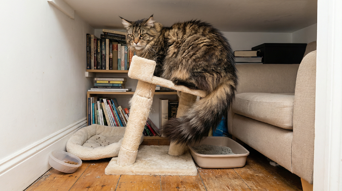 Пространство критично. В однокомнатной квартире мейн-куну тесно. Он постоянно под ногами, сбивает вещи просто потому, что большой. На подоконнике не помещается, на диване занимает половину, на кухне не развернуться. Если квартира маленькая — постоянный хаос. Мейн-кун не для студии и не для однушки. Ему нужна минимум двушка, где есть где разместиться, не мешая всем.