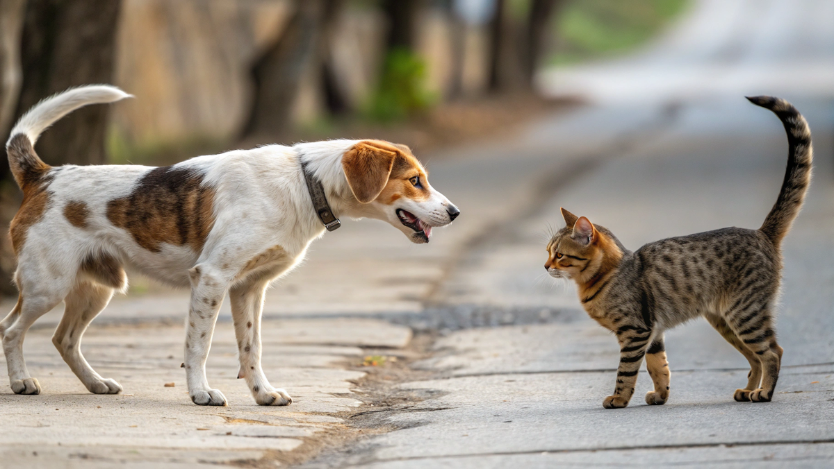 Кошка прижимает уши, шипит, бьёт лапой. Собака не понимает — я дружелюбна, почему нападает. Может гавкнуть, прыгнуть ближе. Кошка воспринимает как подтверждение агрессии, убегает или дерётся. Конфликт рождается из непонимания.
