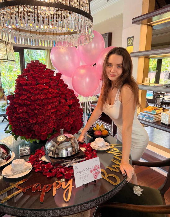 Наследница известной исполнительницы Славы, Александра Морозова, отметила свой день рождения в необычной обстановке. 4 января девушке исполнилось 27 лет, и этот праздник, как и все новогодние каникулы, она провела за границей. В честь события Александра опубликовала в личном блоге трогательный пост, адресованный её любимому супругу. В своём сообщении Морозова откровенно призналась, что часто бывает недовольна собой, но, несмотря на это, к своему возрасту она смогла добиться многого. «С днём рождения меня. Сегодня мне 27 лет! Несмотря на то, что я вечно недовольна собой, я думаю, 15‑летняя Саша бы безумно гордилась 27‑летней Сашей! У которой есть сынок, любимая семья, бизнес, активный блог с замечательной аудиторией, победа в реалити‑шоу и лучшие друзья», — поделилась дочь знаменитости. К своему праздничному посланию 27-летняя бизнесвумен прикрепила яркий снимок. На фото Александра позирует в белом облегающем платье, без макияжа, на фоне роскошного букета алых роз, воздушных шаров и нак