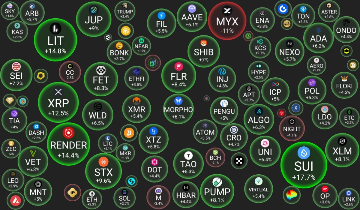 🗓 06.01.2026 09:30 по Москве. 🔗 Посмотреть на сайте 📈 Лидеры роста (из ТОП-100): 🟢 Sui (SUI): $1.9648 (+17.7%) 🟢 Lighter (LIT): $3.0279 (+14.8%) 🟢 Render (RENDER): $2.3724 (+14.4%) 📉 Лидеры падения (из ТОП-100): 🔴 MYX Finance (MYX): $4.8875 (-11%) 🔴 Midnight (NIGHT): $0.0843 (-4.1%) 🔴 MemeCore (M): $1.5528 (-3.4%) 🔍 Основные метрики: 🟢 Общая капитализация: $3206.24 млрд (+2.17%) 🟢 Общий объем торгов: $123.36 млрд (+32.27%) 🔴 Доминация Bitcoin: 58.37% (-0.32%) 🟢 Доминация Ethereum: 12.13% (+0.04%) 🟢 Индекс страха и жадности: 44 / 100: СТРАХ (+18) 🟢 Индекс Альтсезона: 26 / 100: НЕ АЛЬТКОИН-СЕЗОН (+5) 📖 Интересно почитать: 👉 Как заработать на подарках и стикерах в Telegram: подборка сервисов и советы 😻 Наши сервисы и бонусы: ⛏️ Profit-mine.com - калькулятор майнинга криптовалют на GPU/CPU/ASIC 📈 Hyperliquid - крупнейшая DEX биржа, занимает 80% объема рынка DEX фьючерсов
