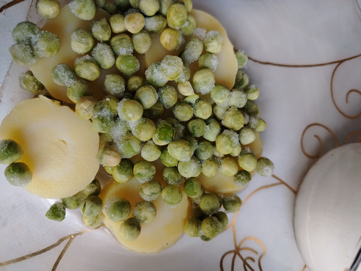 Первым выкладываю картофель, затем зелёный горошек, у меня он замороженный.