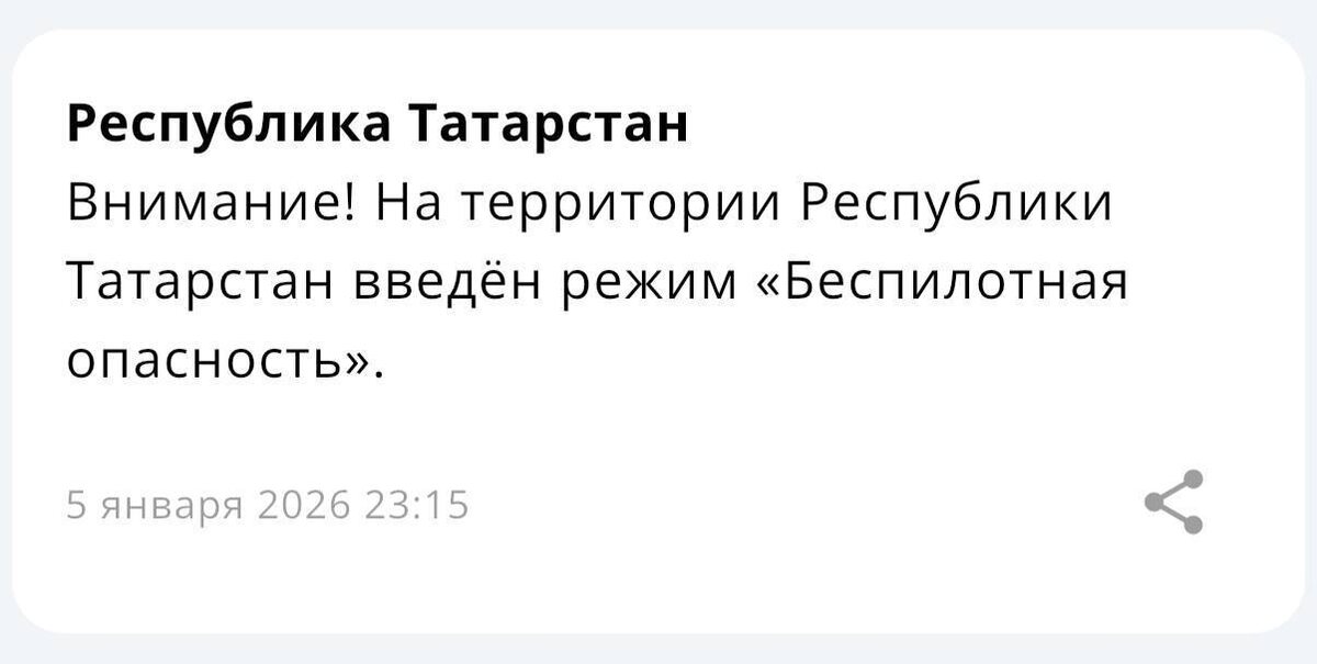 Ночью в республике было неспокойно 👇 ❗️ В 23:15 в Татарстане объявили режим беспилотной опасности ✈️ Аэропорты Казани и Нижнекамска временно закрыли. ☄️ С 02:48 угрозу атаки БПЛА объявили для Нижнекамска, Альметьевска и Елабуги — жителей просили спуститься в укрытия. 🛡 В Минобороны сообщили: ночью над Татарстаном сбили один беспилотник 📊 Всего по стране за ночь перехватили 129 БПЛА ✅ В 9:22 ограничения в аэропорту Казани сняли. ⚠️ При этом режим беспилотной опасности в республике продолжает действовать Следим за обстановкой и обновлениями. Берегите себя 🙏 😃 Подписывайся на most| Набережные Челны | Пришли свою новость
