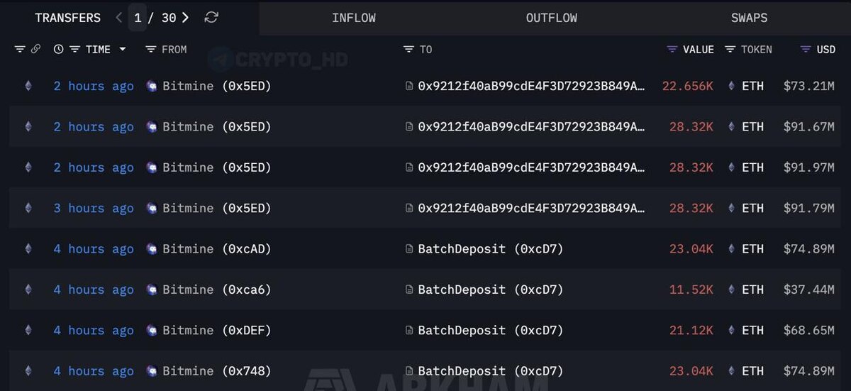 2️⃣ #ETH Компания BitMine отправила в стейкинг еще 186,336 ETH ($604,5m).